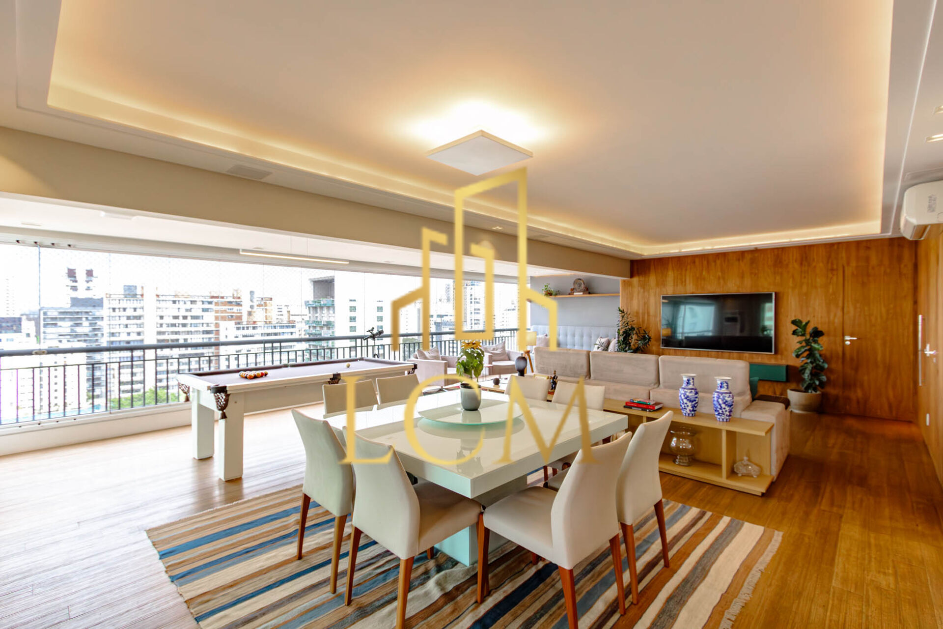 O ar-condicionado presente em todos os ambientes garante conforto durante todo o ano. O living, integrado a quatro ambientes, oferece um espaço amplo e versátil para receber convidados e realizar eventos sociais. A cozinha, no estilo americano, é moderna e funcional, com bancadas em granito e armários planejados, permitindo uma interação constante com a área social do apartamento.