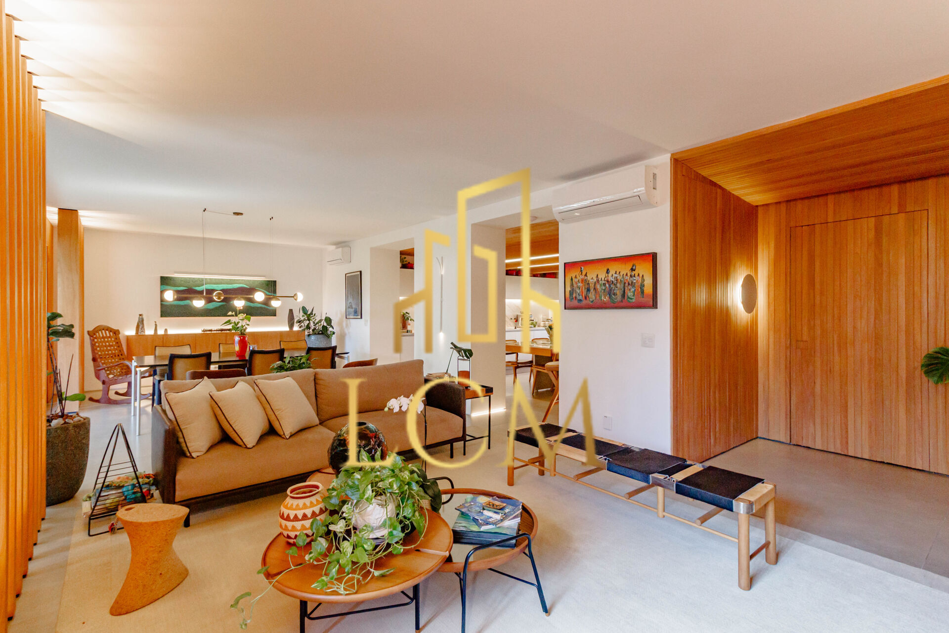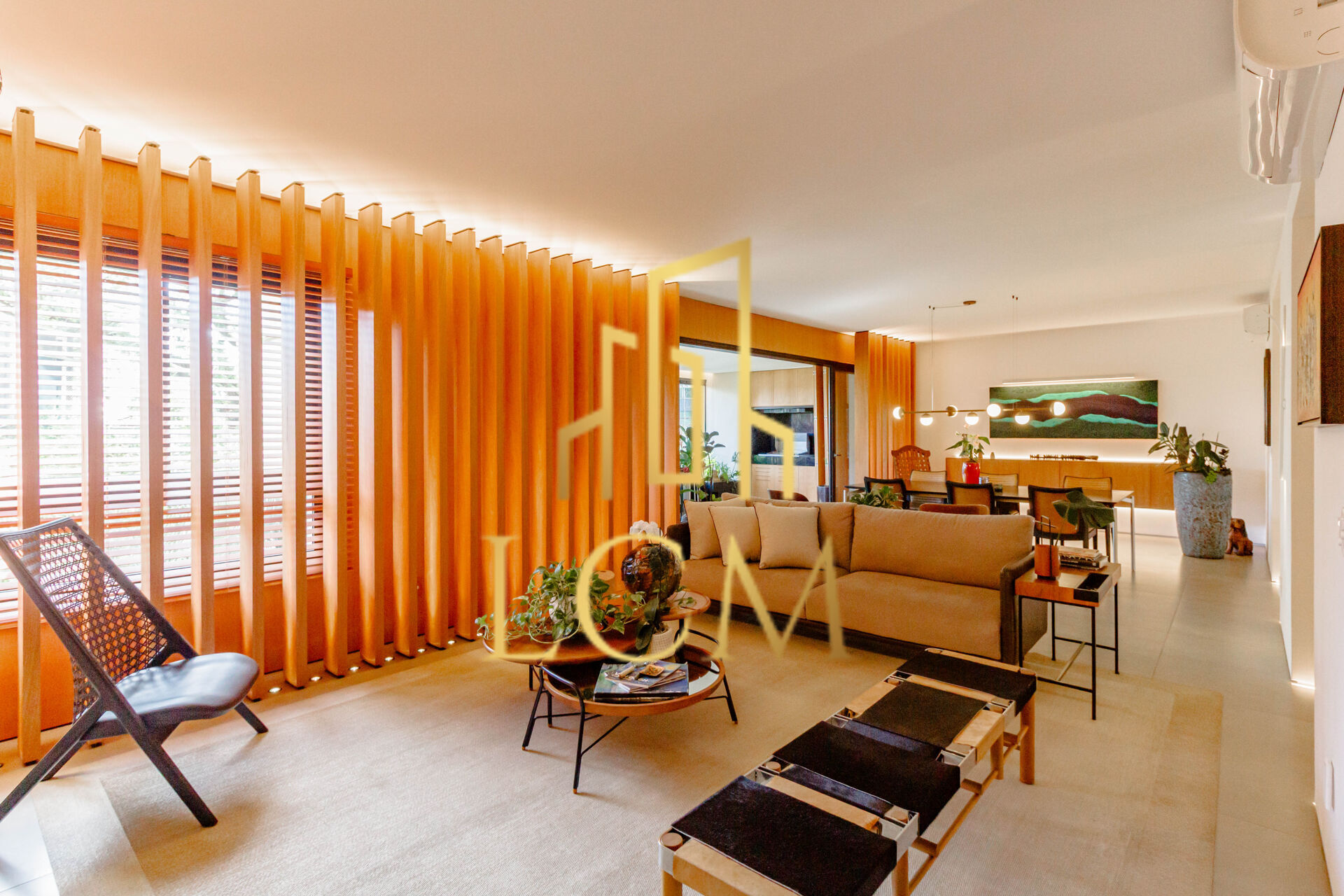 🪟 O living é o coração da casa: amplo, envolvente e iluminado com perfeição pelos brises de madeira, que filtram a luz como uma escultura viva. Andar baixo com vista para copa das árvores e ainda assim com total privacidade — um feito raro, pensado nos mínimos detalhes.